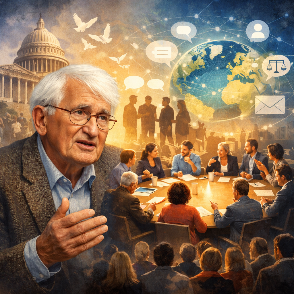 Jürgen Habermas foi um dos pensadores mais influentes da filosofia e da teoria social contemporânea. O seu trabalho concentrou-se sobretudo na forma como a comunicação e o debate público contribuem para o funcionamento das sociedades democráticas. Para o filósofo, uma democracia saudável depende da existência de um espaço público onde os cidadãos possam discutir livremente questões políticas e sociais, partilhando argumentos e formando opiniões de forma crítica.